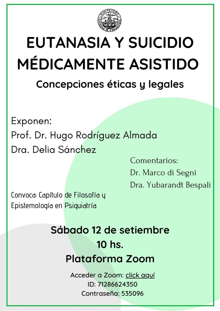 Actividad: Eutanasia y suicidio médicamente asistido. Concepciones éticas y legales Administradorseptiembre 9, 2020septiembre 9, 2020 Novedades Acceder a Zoom: click aquí ← Actividad: “Detrás de la pantalla. Informática médica” 28/8 20.30 hs. Zoom Actividad: “El psiquiatra frente al pedido de eutanasia y suicidio asistido” →